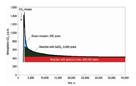 Model simulation describing the absorption of carbon from the atmosphere over 40, 000 years, after large carbon dioxide emissions from fossil fuels combustion | Nature Climate Change (Nat. Clim. Chang.), reproduced from The Long Thaw.