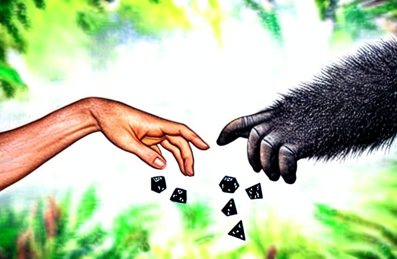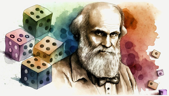 Natural selection is also affected by random processes, and is essentially probabilistic. A drawing of Darwin next to dice cubes. Image | Yonat Eshchar using Midjourney