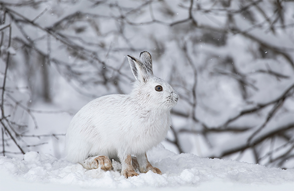 White fur will provide an advantage to an animal that lives in snowy areas. A white Snowshoe Hare in a snowy environment | Jim Cumming, Shutterstock