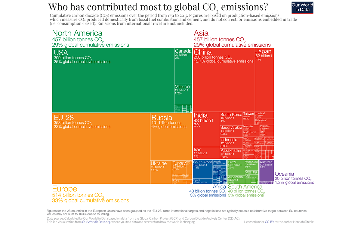 Wealthy countries have historically contributed the most carbon emissions, while most other nations account for only small percentages of the total | Chart: Our World in Data