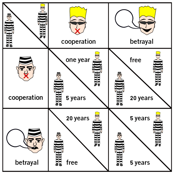 The prisoners’ problem is that each of them is interrogated separately by the police at the same time, which means that neither prisoner has any way of knowing what decision their partner will make. In this situation it’s better for each prisoner to betray his partner, regardless of the decision made by the partner. Why? Let’s examine the different options: if their partner chooses to remain silent, the prisoner should confess and go free instead of spending a year in jail because they also preferred to remain silent; if their partner confesses, our prisoner should certainly confess to the crime and sit in jail for only five years instead of twenty. The second prisoner uses the same reasoning, and both prisoners end up blaming each other, resulting in both going to jail for five years.