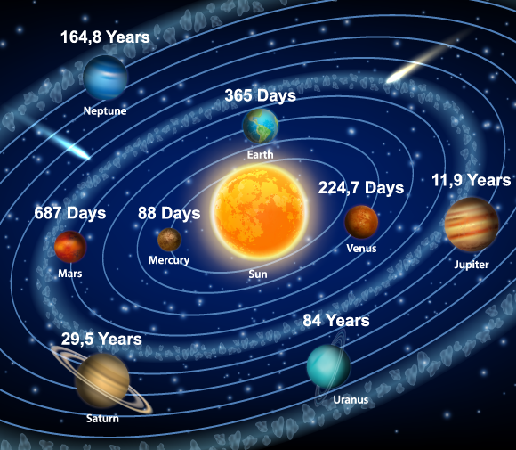 Roughly located on the same plane. Planets and their rotation time around the sun | iberian Art, Shutterstock