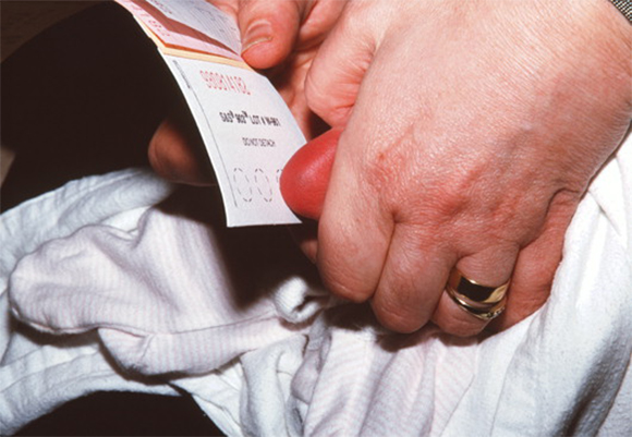 Many countries have mandatory newborn screening programs that include testing for phenylketonuria (PKU). Testing phenylalanine levels in an infant’s blood | Simon Fraser / Science Photo Library