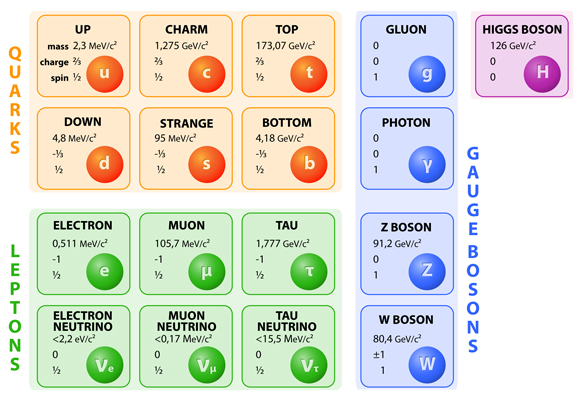The bosons of the Standard Model carry three of the four fundamental forces. Their movements and interactions with other particles are what we interpret as the actions of these forces. The first boson, and perhaps the most commonly familiar boson, is the photon, which is the particle that carries the electromagnetic force. Additionally, there are three bosons that carry the weak nuclear force (W+, W-, and Z) and eight bosons that carry the strong nuclear force, called gluons. The last boson, which is the most recent piece of the Standard Model to be discovered, is the Higgs boson. Named after Peter Higgs, one of the scientists who predicted its existence in the 1960s, the Higgs boson was finally discovered in CERN’s Large Hadron Collider, and some of the researchers who predicted its existence were awarded the Nobel Prize in Physics a year later. The Higgs boson is not associated with a specific force, but through a mechanism called “symmetry breaking,” the Higgs particle imparts mass to other particles in the theory. In the Standard Model, there is no boson that carries the force of gravity, which we will discuss later.