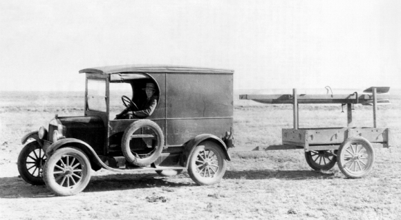 Lone soldier. Goddard driving one of his rockets to the launching point, circa 1930 | Photograph: Science Photo Library