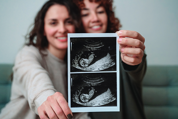 האם המיועדת, ולפעמים גם השותף או השותפה שלה לחיים, דווקא רוצים לדעת פרטים מסוימים על התורם. זוג נשים מראה למצלמה תמונות אולטרסאונד של עובר | Shutterstock, Nuva Frames