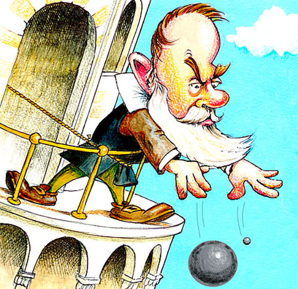 הסיק שמהירות הנפילה של גוף איננה תלויה במשקל שלו. קריקטורה של גלילאו גליליי מפיל שני חפצים ממגדל | Gary Brown, Science Photo Library
