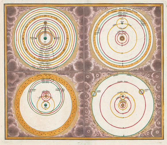 המודל הגיאוצנטרי (שמאל למעלה) ומודלים הליוצנטריים (ימין למעלה ולמטה). דיאגרמה מהמאה ה-18 המציגה מודלים למסלולי הגופים השמימיים | Rijksmuseum, Science Photo Library