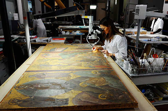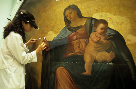 כדאי לנקות כתמים על יצירות אמנות, יש להשתמש בחומרים מיוחדים. ניקוי של ציור מהמאה ה-15 | Pasquale Sorrentino / Science Photo Library