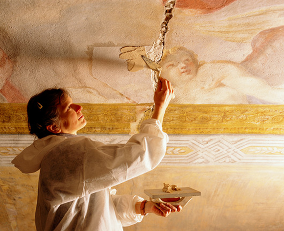 רסטורציה עוסקת גם בחיזוק אבנים ומבנים. תיקון של סדק בתקרה מצוירת של כנסייה | Mauro Fermariello / Science Photo Library