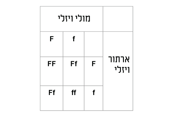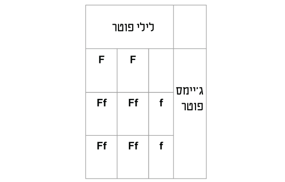 איך זה עוזר לנו להבין מה קורה בדור הבא? אנחנו יודעים שללילי פוטר, אמא של הארי, היו נמשים, ושלג’יימס פוטר לא היו. אם שניהם הומוזיגוטים, אז לילי היא FF וג’יימס הוא ff. אם ניצור טבלה שמרכזת את כל השילובים האפשריים נגלה שבמקרה הזה, לכל הילדים יהיו נמשים וגנוטיפ Ff.
