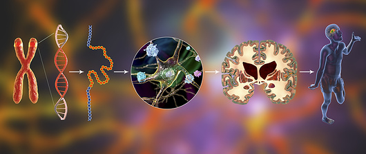 חזרות מרובות של שלושה נוקלאוטידים ברצף ה-DNA מובילות לייצור חלבון פגום ולפגיעה בתאי עצב במוח. איור להמחשת הסיבות והגורמים למחלת הנטינגטון, מחלה בהורשה דומיננטית | Kateryna Kon, Science Photo Library