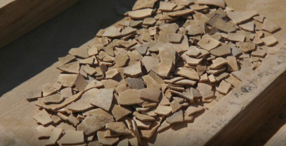 שברים של קליפות ביצי יען שנאספו באתר באר מילכה בחפירה שמנהלת לורן דיוויס | צילום: אמיל אלג'ם, רשות העתיקות