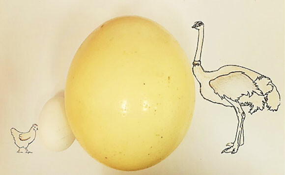 מימין לשמאל: יען, ביצת יען, ביצת תרנגולת ותרנגולת. מקורה של ביצת היען באפריקה במאה ה-20 | צילום ואיור: יעל עבאדי-רייס, רשות העתיקות