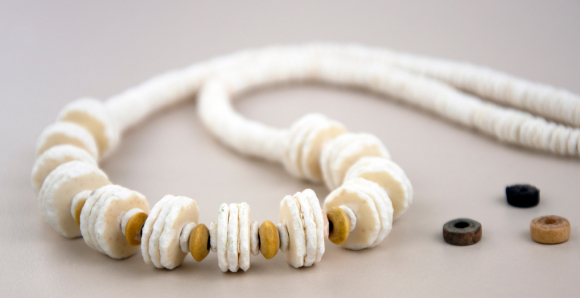 חרוזים, מקדחי צור ואבני שחיקה וליטוש שנמצאו בחפירות מעידים שבעולם העתיק ייצרו חרוזים בשיטות דומות לשיטות בנות ימינו. מחרוזת בת ימינו מחרוזים העשויים מקליפות ביצי יען | Bryony van der Merwe, Shutterstock
