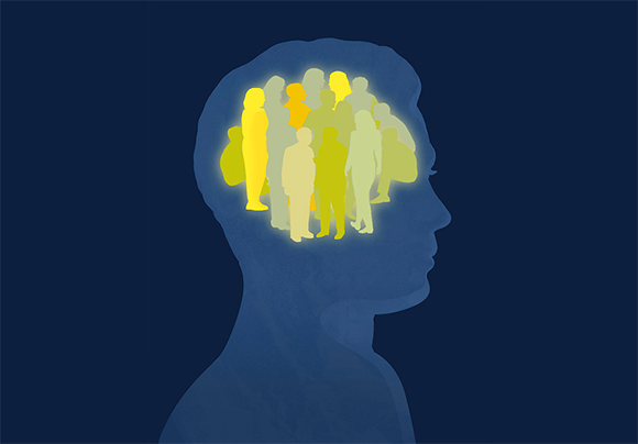הזהות שלי נבנית כחלק מהשייכות שלי, אני בת, אחות, אמא ועוד. אילוסטרציה של מוח אדם המורכב מאנשים רבים | Sam Falconer, Debut Art / Science Photo Library