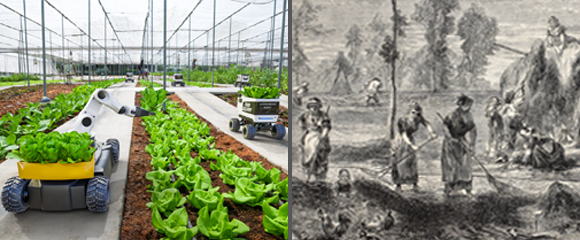 במהלך התקופה הכלקוליתית הובילה החקלאות לצבירת רכוש מכל מיני סוגים. חקלאות במאה ה-19 בצרפת (ימין) וחקלאות מודרנית וממוכנת בת ימינו (שמאל) | Marzolino; Suwin, Shutterstock