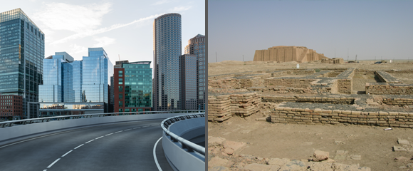 בתקופת הברונזה הקדומה החל העיור באזורנו. עתיקות מן המאה ה-21 לפנה”ס בעיר אור בשומר במסופוטמיה (ימין) ונוף אורבני בבוסטון, ארצות הברית (שמאל) | ויקיפדיה, נחלת הכלל; VideoFlow, Shutterstock