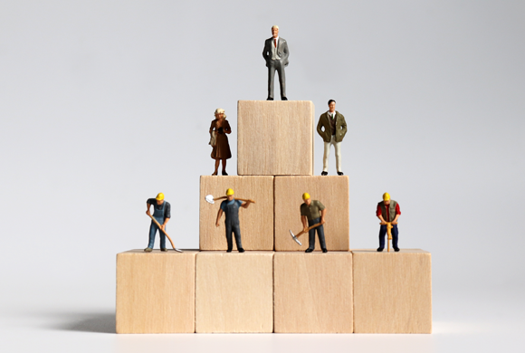 החלוקה למעמדות הלכה והפכה לקבועה יותר. דמויות מיניאטוריות של אנשים מוצבות על פירמידה מקוביות | Hyejin Kang, Shutterstock