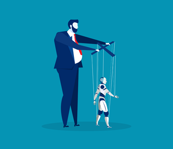 לכאורה אוטונומיים, אך למעשה מושפעים מהטיות אנושיות וחלקם אף כפופים לשליטה אנושית ישירה, גם אם חלקית. אדם מושך בחוטים של רובוט | TA design, שאטרסטוק