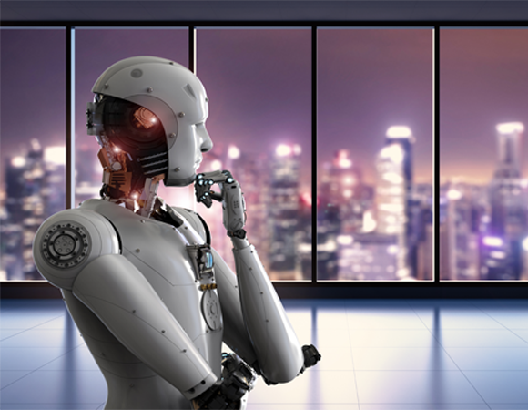 עקב הנוכחות הפיזית שלהם, אנו נוטים להאניש רובוטים חברתיים ואפילו להיקשר אליהם. רובוט בפוזה מהורהרת | Phonelamai Photo, שאטרסטוק