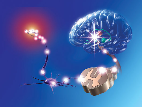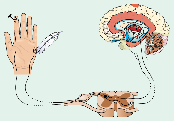 כמעט בכל איברי הגוף יש קולטנים לכאב, וכשהם מופעלים הם מעבירים אות חשמלי למוח. אילוסטרציה של מעבר האותות מקולטני הכאב למוח | Marc Phares, Science Photo Library