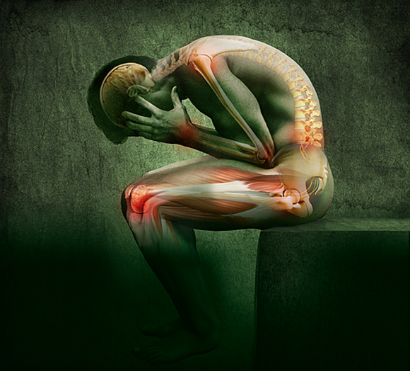 נראה שהקללה גורמת להפעלה חזקה של כל סוגי הקולטנים של הכאב. אילוסטרציה של אדם השרוי בכאבים | Claus Lunau, Science Photo Library