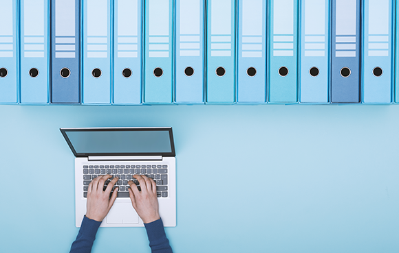 הדיגיטציה פינתה שטחי מדף עצומים והחליפה אותם בטרה בייטים רבים של מידע. מחשב לצד שורת קלסרים | Shutterstock, Stokkete