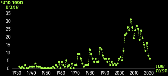 מספר סרטי הזומבים שהופקו בעולם לפי שנת הפצה