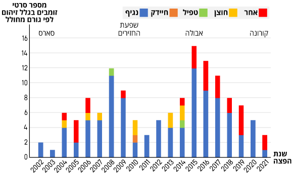 סרטי זומבים עקב זיהום משנת 2000 והלאה. בקטן מעל העמודות: אירועי התפרצות עולמיים בעלי פוטנציאל להפוך למגפות