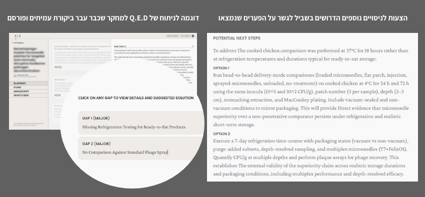 Q.E.D יודע להצביע על פערים במחקר ולהציע פתרונות. דוגמה לתוצר של הפלטפורמה בתגובה לבדיקה של מחקר שפורסם לאחרונה בכתב עת מדעי מוערך | מקור: צילום מסך בעת בדיקת הפלטפורמה, צוות תקשורת המדע. אושר לפרסום ע"י עודד רכבי
