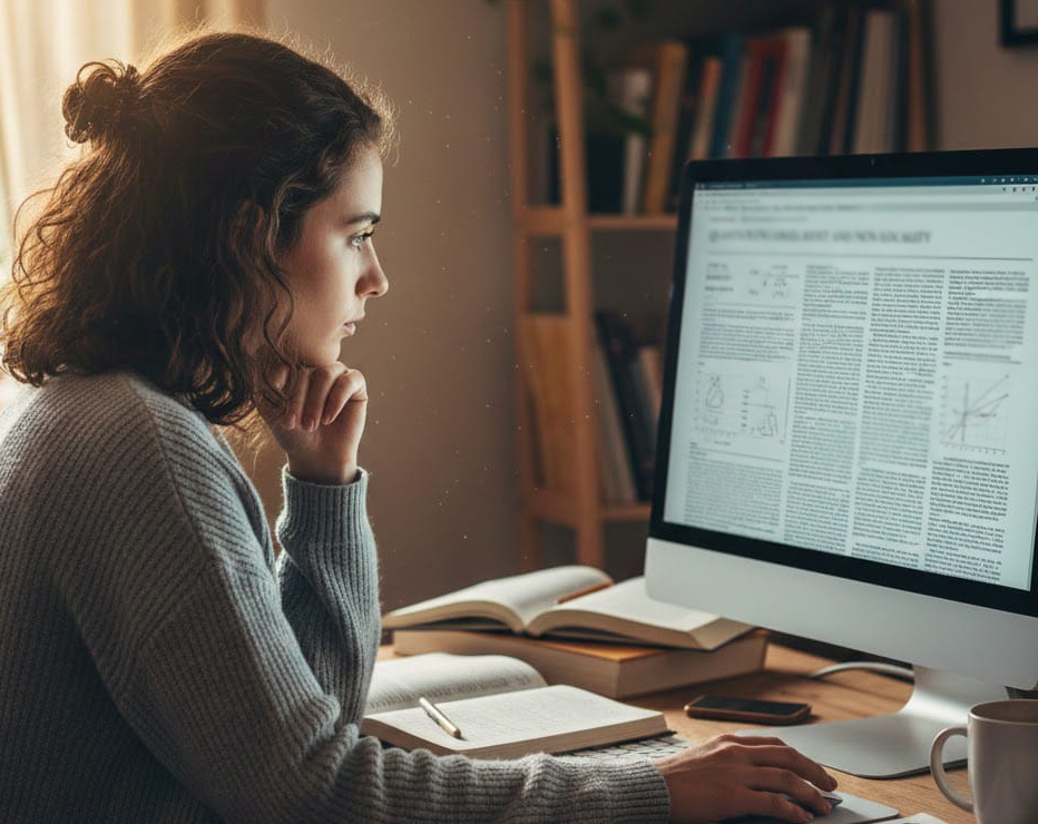הפלטפורמה החדשה עשויה לצמצם הטיות הקשורות לוותק או מעמד אקדמי ולהעניק הזדמנות שוויונית יותר לכל החוקרים. דיוקנה של חוקרת: יושבת ומרפרשת את העמוד בציפייה להחלטת הבוחנים | מקור: ליאת פלי באמצעות ג'מיני