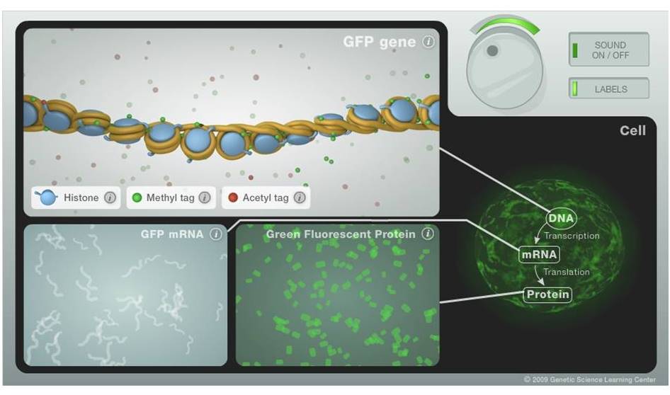 היישומון פשוט יחסית לתפעול. כל שעליכם לעשות הוא לסובב את הכפתור שכתוב עליו Sound ולעקוב אחר השינוי שחל בביטוי של החלבון הפלורסנטי GFP (ירוק). בחלון העליון מופיעה תצורת הדנ"א ברמות הקיפול השונות שלו ועם הסמנים הכימיים השונים (קבוצות מתיל ואצטיל). בחלון התחתון הימני אפשר לראות את כמות מולקולות ה-mRNA של חלבון ה-GFP, בחלון הימני התחתון תראו את הביטוי של החלבון GFP, ובחלון הימני אפשר לראות איך נראה הביטוי שלו בתא השלם.