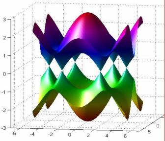 סימולציה ממוחשבת של רמות האנרגיה של האלקטרונים בגרפין כפונקציה של התנע בשני הכיוונים האפשריים (העקומה מציינת את האנרגיה, הצירים הם התנע של האלקטרון) ניתן לראות כי במספר נקודות הרמות מתכופפות זו לכיוון זו, עד שהן נוגעות זו בזו בנקודות בודדות. וכי השיפוע של הרמות בנקודות אלו, זהה ברמה הגבוהה והנמוכה (עד כדי היפוך סימן).