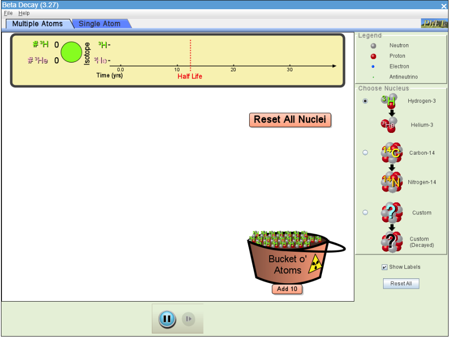 היישומון ממחיש את נושא הדעיכה הרדיואקטיבית על ידי שימוש בדעיכת בטא (לחצו על התמונה):