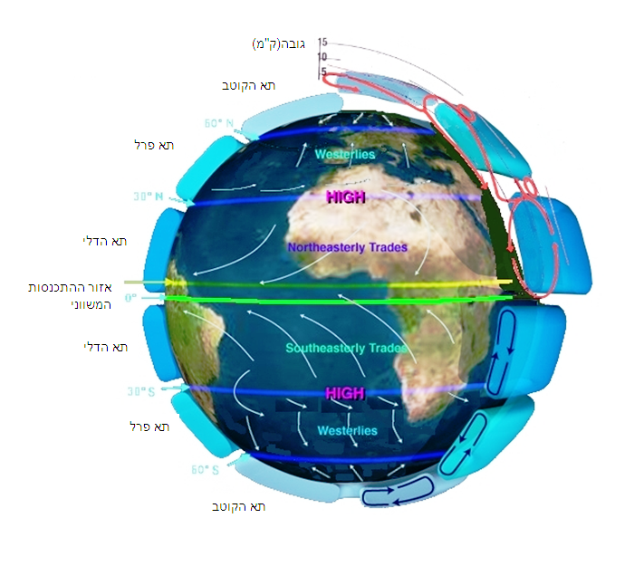 המחשה תלת-ממדית של מהלך הרוח בשלושת התאים סמוך לפני כדור הארץ וברום | איור: ויקיפדיה