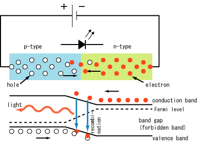 LED, (או למעשה כל דיודה) הינה צומת בין שני מוליכים למחצה מסוגים שונים. בצד אחד קיים מוליך למחצה עשיר באלקטרונים (N-type), בצידו השני קיים מוליך למחצה עשיר בחורים (P-type), כלומר בעל מחסור רב של אלקטרונים ברמת הערכיות.