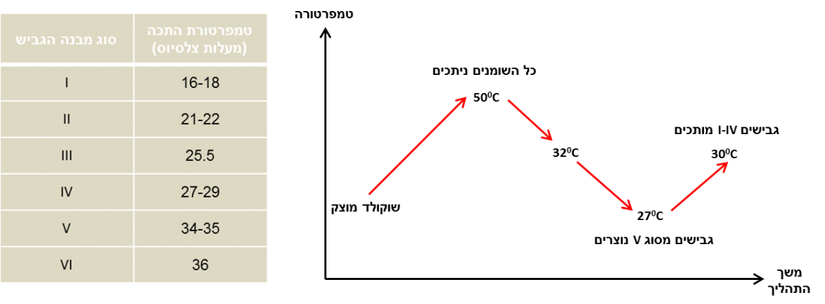 טמפרטורות ההתכה של כל מבנה גבישי של חמאת הקקאו ותהליך הגיבוש הנדרש לצורך קבלת המבנה הגבישי