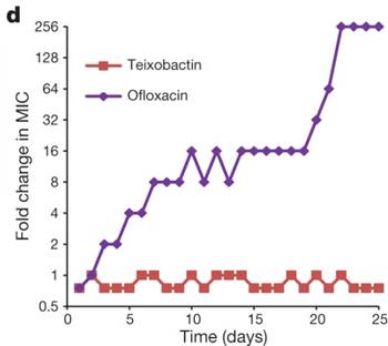 החיידקים לא פיתחו עמידות לאנטיביוטיקה בטיפול ארוך של חודש (אדום), לעומת אנטיביוטיקת הביקורת (סגול) שנגדה פיתחו עמידות | LL Ling et al. Nature 000, 1-5 (2015) doi:10.1038/nature14098