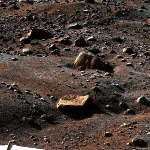 צילום מרכב החלל עם זריחת השמש, ניתן לראות שאריות של קרה על גבי אדמת המאדים אשר נעלמו מאוחר יותר כאשר השמש חיממה את פני האדמה במעט
