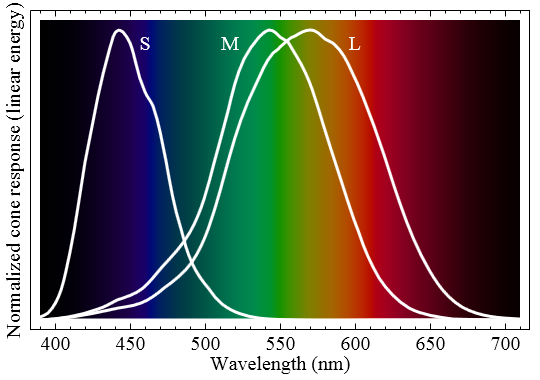 אורכי הגל שכל אחד משלושת סוגי התאים רגיש אליהם. חפיפה רבה בין תאים מסוג M ו L | מקור: נחלת הכלל, ויקיפדיה