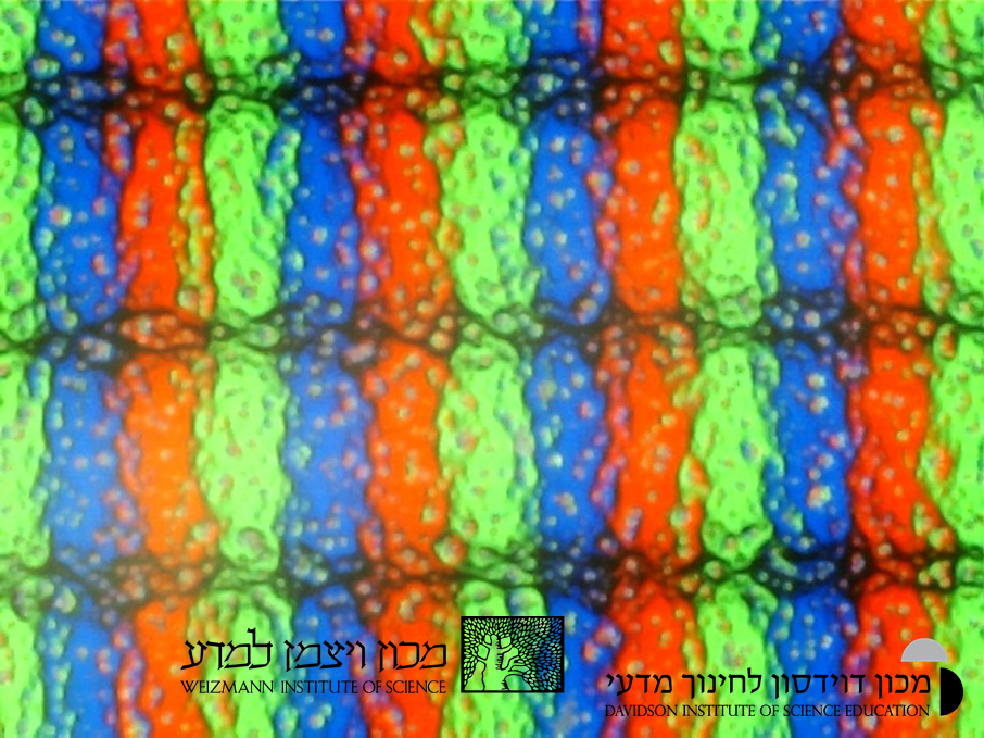 צילום של מסך מחשב המציג צבע לבן, בהגדלה פי 400. רואים שהמסך מורכב מאזורים צפופים המאירים בצבעי אדום, ירוק וכחול
