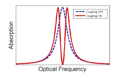 בקו אדום – ספקטרום הבליעה לאחר שהופעל הלייזר המשני. ניתן לראות כי כתוצאה מהפעלת הלייזר המשני, לפתע ישנה ירידה חדה בפיזור האור בתדר המקורי, והוא עובר בקלות דרך גז האטומים.