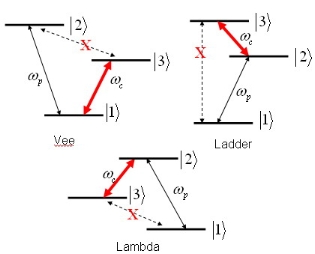 בתמונה ניתן לראות 3 קונפיגורציות שונות המולידות לתופעת השקיפות. בכל תמונה מסומנות שלושת רמות האנרגיה, ושתי תדירויות הלייזרים – Wp הינה תדירות/אנרגיית האור המקורי וWc הינה תדירות/אנרגיית האור המשני.
