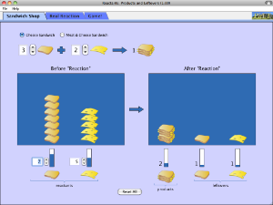 תחילה נגדיר שכריך מוכן משתי פרוסות לחם ופרוסת גבינה אחת. כתבו בחלונות העליונים את הערכים 2 עבור הלחם ו-1 עבור הגבינה. כעת בואו נשחק. התחילו להעלות את ערכי הגבינה והלחם בחלון התחתון ושימו לב מה אתם מקבלים בחלק הימני של התגובה. שימו לב שכאשר מזינים כפולות של 2 עבור הלחם ומחצית הכמות גבינה מקבלים כריכים שלמים, בעוד שבמצבים אחרים מקבלים כריך עם שאריות. הלחם והגבינה הם המגיבים והכריך הוא התוצר. עודפי הלחם והגבינה הם השאריות. בתגובה מאוזנת אסור שיישארו שאריות.