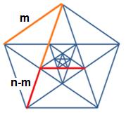 נתחיל בהוכחה ונסתכל שוב על סדרת המחומשים שנוצרו מחיבור האלכסונים. נשים לב בציור שההפרש בין האלכסון של המחומש הגדול, שאורכו $n$, לבין הצלע של אותו מחומש (בכתום), שאורכו $m$, שווה לאלכסון של המחומש הקטן יותר (באדום). כלומר, אורכו של אלכסון המחומש הקטן יותר הוא $n-m$.