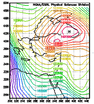 רמה טורקית מ-13 בינואר 2009. הרמה באדום, בלחץ מרבי של 1,037 מיליבר