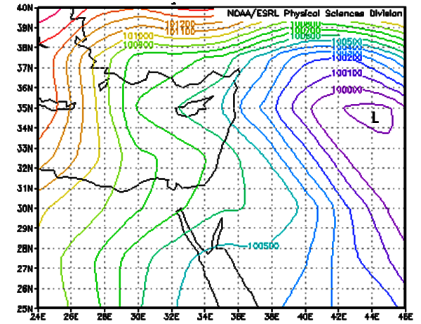 שקע מעל קפריסין מ-13 בדצמבר 2013. השקע בסגול, בלחץ המינימלי: 1,010 מיליבר. הלחצים מצוינים בפסקל | כל המפות לקוחות ממעבדת המחקר Earth System של המוסד הלאומי לאוקיינוסים ואטמוספירה של ארה"ב