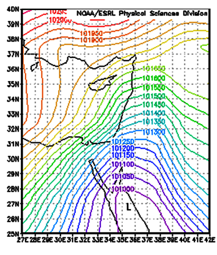 אפיק ים סוף מ-22 באוקטובר 2013. האפיק בקווים סגולים-כחולים, בלחץ מינימלי של 1,010 מיליבר