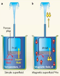 בתמונה (a) מתוארת התופעה של מזרקת העל-נוזל: בין שני חלקי הכלי ישנו שסתום ספוגי אשר רק על-נוזל חסר חיכוך יכול לעבור דרכו. הפרש הטמפרטורות (∆T) בין שני חלקי הכלי יוצר הפרש לחצים, אשר מניע את הזרימה כלפי מעלה. בתמונה (b) אנו רואים את זוגות החלקיקים המרכיבים את העל-נוזל (צהוב) כאשר לכל אחד מורכב חץ קטן. חץ זה מסמן את כיוון המומנט המגנטי הפנימי של האטום, המתיישר עם כיוון השדה המגנטי (B) החיצוני. מאחר שרק העל-נוזל יכול לעבור את המחסום הספוגי, כל הזרם במזרקה הינו ממוגנט. במקרה זה הפרש הלחצים שהינו מקור הזרימה נובע מהפרש בשדה המגנטי (∆B), אשר הנוזל "שואף" לאזן.
